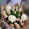 Очаровательно нежные белые розы – идеальное композиционное решение для букета, в сочетании нежно розовых кустовых роз, который прекрасно подойдет как классический подарок, так и в тематическое торжество. А так же можно сказать что ,  младшие сёстры королевы цветов в паре покорят сердце любой девушки